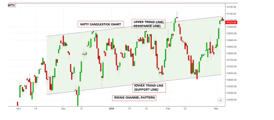 1. Up trending Channels or Rising Channel- also known as "Ascending Channels" 2. Down trending Channels or Falling Channel- also knowns as "Descending Channels" 3. Horizontal Channels or Flat Channel - defined by two horizontal lines.