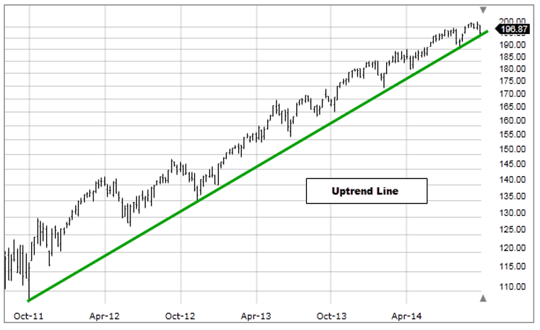 One way for an analyst to see the trend is by drawing what are called trend lines. A trend line is a straight line that connects 2 or more price points and then extends into the future to act as a line of support or resistance. Many of the principles applicable to support and resistance levels can be applied to trend lines as well.
